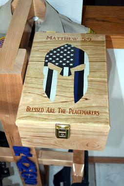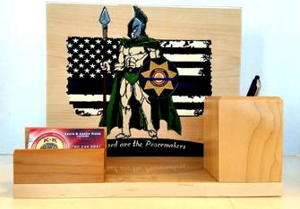 Peace Makers Desk Center Piece can be ordered with any sheriff or Police badge. The card holder and pen holder can be attached or non- attached to the Base. The Center Piece can also be mounted on the wall for a small shelf. (Female Peace Keeper also Avalibile).